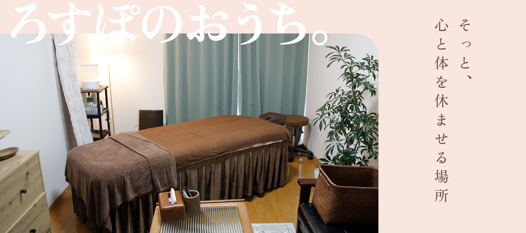 ろすぽのおうち。は、マンションの一室を貸し切った完全プライベートサロン。お一人おひとりの体調や気分に合わせて、「揺らして緩め、押して流す」をモットーにやさしい施術を行っています。